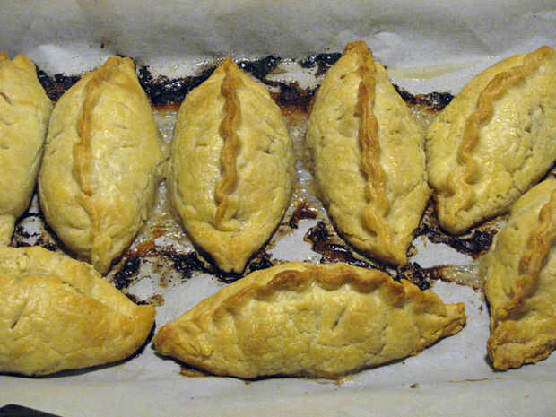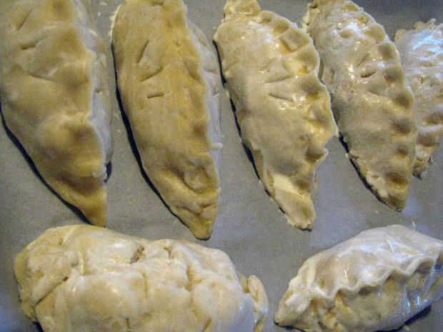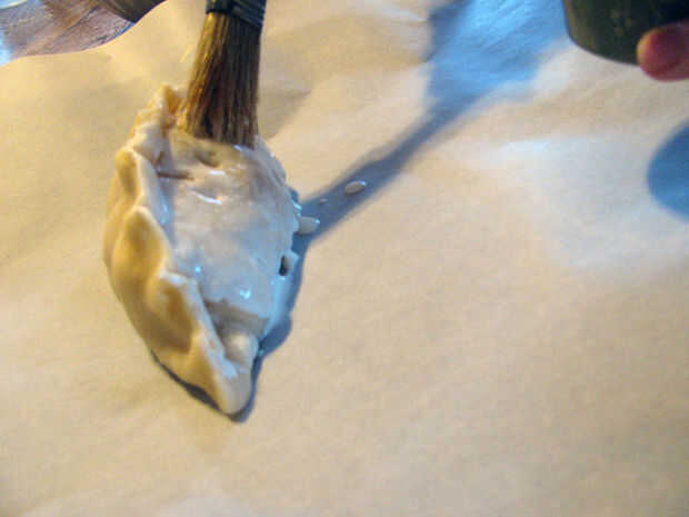 Coloque cada pasty en una placa para horno forrada con, dar un par de pulgadas de espacio entre cada uno. PINCELAR las empanadas con la crema de leche o leche.