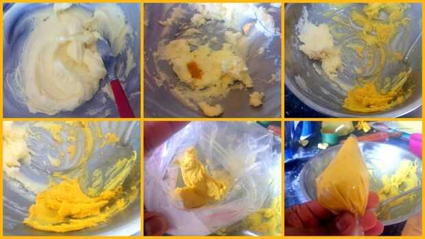 • Para glaseado amarillo, agregar el polvo de la cúrcuma en la crema frosting de mantequilla de miel y mezclar bien para obtener el glaseado amarillo.