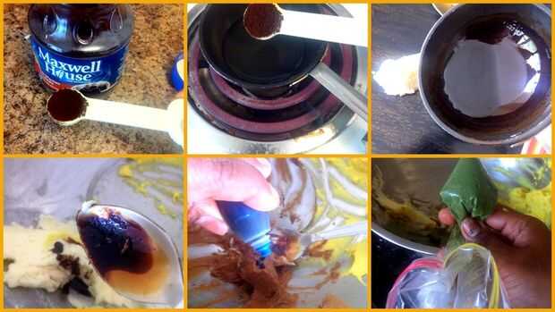 • Para el glaseado de café, hervir el café en polvo en poca agua, luego agregue esto decaution para el glaseado blanco y mezclar bien.