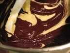 En un recipiente grande, usando una batidora eléctrica en velocidad media, bata la mantequilla y el azúcar hasta ligeros y mullidos, 3-5 minutos. Añadir los huevos, uno a uno, batiendo bien después de cada adición. Luego agregar la vainilla y el chocolate enfriado y mezcle hasta que quede mezclado. Reducir la velocidad y añadir la harina y la leche en pequeñas cantidades alternas.
