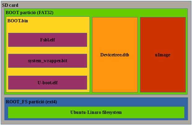 En la imagen pueden ver la tarjeta SD con las particiones y los archivos que tendremos que crear para arrancar linux desde el zybo.