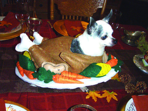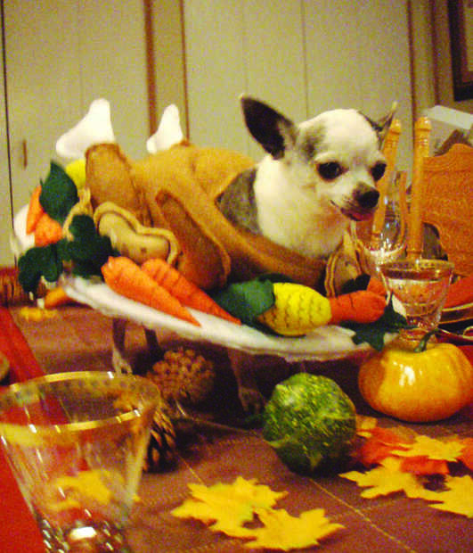 comencé haciendo que el cuerpo de Turquía. Que hice en la forma de sus chaquetas del perro fue coser las dos piezas de fieltro a lo largo de los bordes donde dejé un poco 1/4 de una edg. Un poco de peluche el cuerpo con un poco de algodón para darle un poco más de cuerpo. Luego corté el tablero de la espuma para que era la forma de un plato y cubiertos por encolado blanco sentía a él. Cuando hice el cuerpo Turquía he dejado un poco tela alrededor de la parte inferior de la chaqueta del cuerpo de Turquía para sujetar a la parte del plato del traje. Desde que el cuerpo de Turquía como su chaqueta sólo naturalmente equilibrado en su cuerpo. Por lo que es casi como que le hizo un pequeño flotador cuando él camina alrededor porque equilibra perfectamente. Luego hice las piernas que se cose al trozo de fieltro cortado en forma de una pierna de pavo y coser juntos sobre un 1/4" alrededor de los bordes. Luego hizo los huesos en el sam forma mano les cosieron y rellena con relleno de algodón y guned de pegamento caliente en el cuerpo del traje. Los vegetales fueron hechas de fieltro por separado cosida parcialmente en la máquina de coser y también piezas cosidas luego llena de algodón relleno para darles cuerpo y luego pegado a la parte del plato y la parte del cuerpo del traje de la mano. Los pequeños detalles sobre el maíz, papas y zanahorias se realizaron con sharpie. Encontré patrones para fieltros hortalizas en línea que eran maíz, zanahorias, patatas. Básicamente se hizo como una chaqueta del perro sólo con cosas extra adjuntas. Las diapositivas sólo traje encima de su cabeza y equilibra la espalda.
