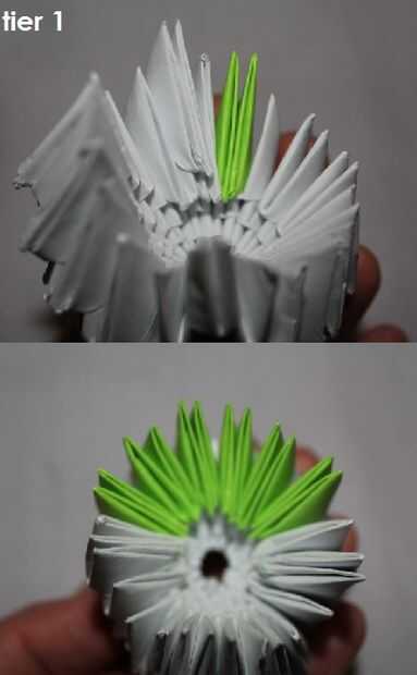 - Nivel cuatro: Deslice el bolsillo izquierdo del triángulo verde en el vértice izquierdo del triángulo de tercer nivel. Triángulos verdes y amarillas alternas hasta que hay un punto en el extremo. Deslice el bolsillo derecho de un triángulo verde en el punto de.