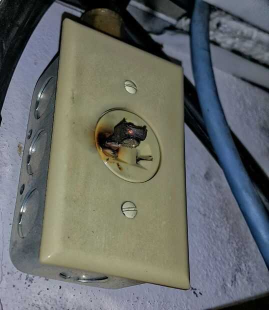 ¿Por qué sucedió esto? La conexión de los cables a esa hoja de enchufe no fue hecha y dio lugar a un punto de alta resistencia. Con el tiempo con el compresor de AC ciclismo, calefacción y refrigeración que indebidamente hizo conexión punto empeoró el problema. El cable sí mismo empezó a arder. Este es un ejemplo de riesgo de incendio debido a la conexión de cables mal!