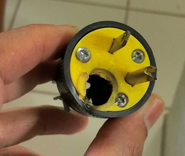 Aquí es un ejemplo de un enchufe de alimentación de unidad de aire acondicionado de 220 voltios. La unidad trabajó impecablemente durante 7 años hasta que un día dejó de enfriamiento. Cuando el enchufe fue tirado lejos de la toma de corriente de 220 voltios, una cuchilla permaneció en el receptáculo.