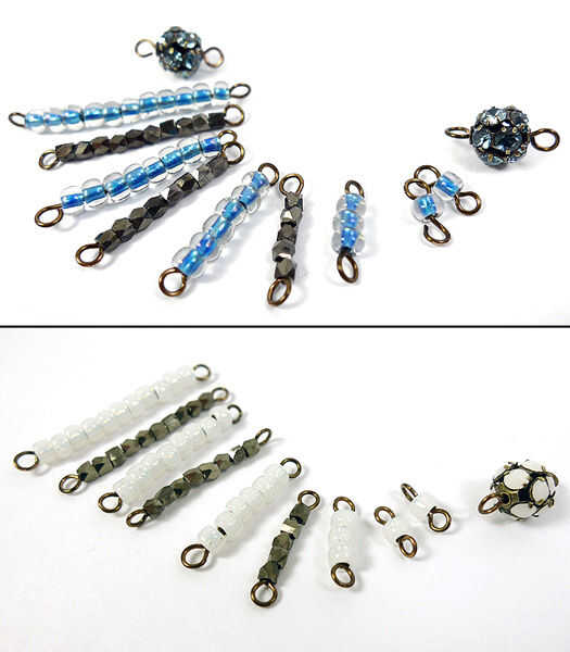 Usar sus alicates de punta redonda para crear un bucle en el extremo del alambre. Una tira de 6-0 en el cable del hilo de rosca, doblar y recortar el alambre para crear un vínculo bucle con un grano. Ajuste los lazos necesarios para que ambos afrontan la misma manera. Repita los pasos para crear un vínculo de grano de 1 segundo. Utilizando la misma técnica crear enlaces con: granos de tres 6/0 5 abalorios cubo presentado, granos seis 6/0, 8 abalorios cubo presentado, granos de ocho 6/0, 10 cuentas de cubo presentado y granos de once 6/0. Apartar estos enlaces.