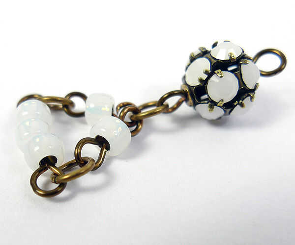 Usando anillas y sus alicates de cadena unen a cada extremo del enlace 5-grano el enlace 3-grano. Continuar por el pendiente, añadir cada enlace mediante el uso de anillas para unir el enlace anterior. Después de haber conectado el enlace 11 grano uso saltar anillos para unir una sección de cadena de 1 pulgada a cada lado del enlace 11-grano. Coloque la bola de cristal de Swarovski restante a ambos extremos de la cadena, ligándolos juntos y terminar el pendiente.