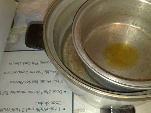 Este paso es muy fácil. Añadir agua a la olla de vapor arroz, capa de la taza de aceite (aproximadamente 2 pulgadas de alto) y coloque el recipiente en el horno.