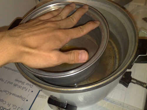 Me soplo pollos en mi jardín. Un pollo se anotó hasta el hueso. Marinado con cilantro picado (cilantro) raíz, cúrcuma fresca, chiles, salsa de pescado y azúcar de Palma. Lemongrass es relleno en la cavidad y se alza sobre una botella de cerveza.Un ta