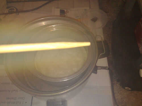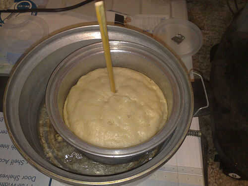 Después de una hora de cocción, pegar un palillo/Mondadientes en el centro de la crepe. Si no hay ninguna humedad en el palo, luego su 90% hecho. Cierre la tapa y espere otra 1/2 hora.