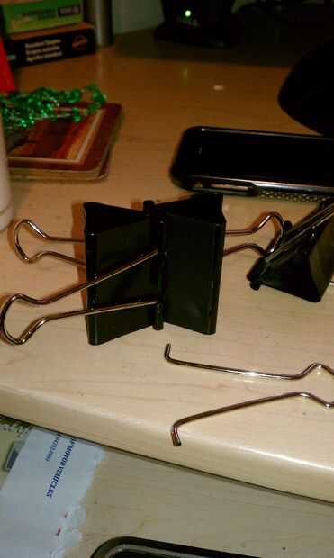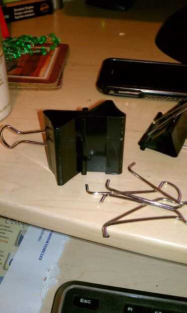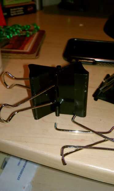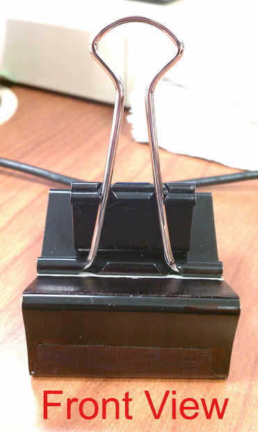 Materiales utilizados: dos grandes Clips de carpeta y media Binder clips. Cinta de enmascarar o cinta aisladora (negra) y una pequeña pieza de 3M doble cinta adhesiva de' montaje'.