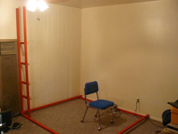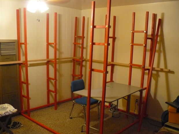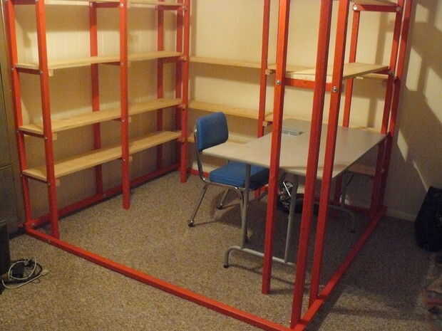 Este cubículo está construida de cerca de 30 2x2s para enmarcar, 1x10s para estantería, hardware consiste en 1/4 de pulgada, tuercas y arandelas de bloqueo y defensa. Unos tornillos fijar los estantes. Estaba seguro de que la 2x2s iban a ser bastante fuerte, pero con los soportes intermedios en medio de cada lado, su abundancia fuerte. Tenía la pintura roja y algunos de la madera y la mesa de su construido alrededor, pero creo que todo esto se podría hacer alrededor del máximo de $100. Mucho más barato que el equivalente de estantes de las tiendas comprados!
