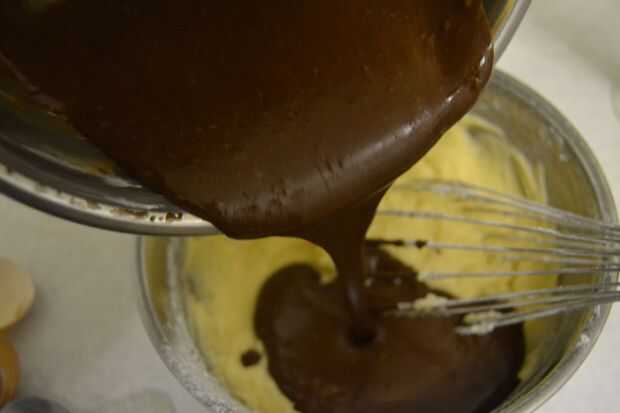 poner la mantequilla blanda y el azúcar en otro cuenco y batir hasta que la pálida y esponjosa. Añadir los huevos y batir un poco más hasta que estén compltely incorporado. mezclar harina, sal y soda y añadir al bol. batir otra vez hasta tener una mezcla homogénea, luego agregar la mezcla de chocolate del otro recipiente y bate hasta que se mezcle.