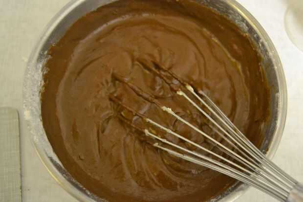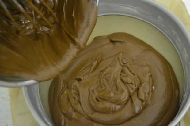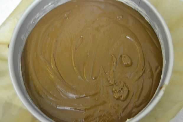 poner la tarta en el horno y hornea durante unos 35 minutos, hasta que un palillo insertado salga limpio. Cuando el pastel esté hecho, seguirá siendo muy suave y se verá húmeda, pero si el palillo se queda limpio está hecho.