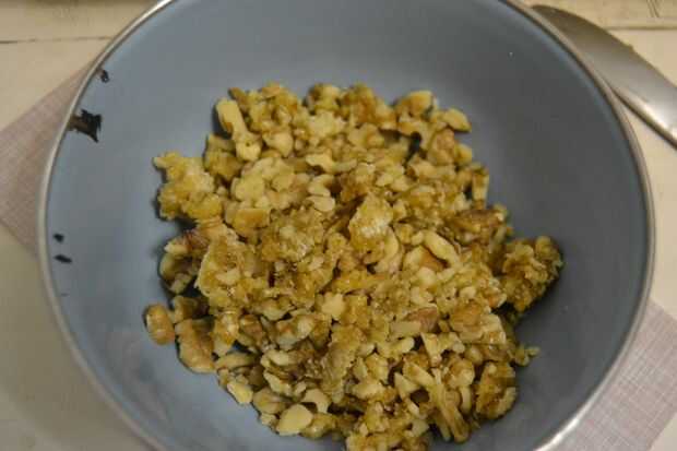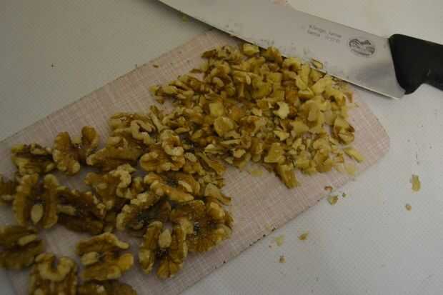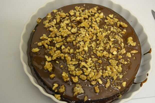 Espolvorear las nueces caramelizadas sobre la torta y poner la torta en un lugar fresco y seco hasta que la cobertura de chocolate tiene hardend.