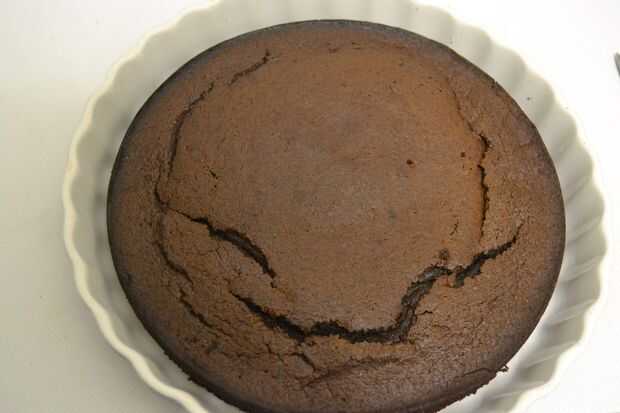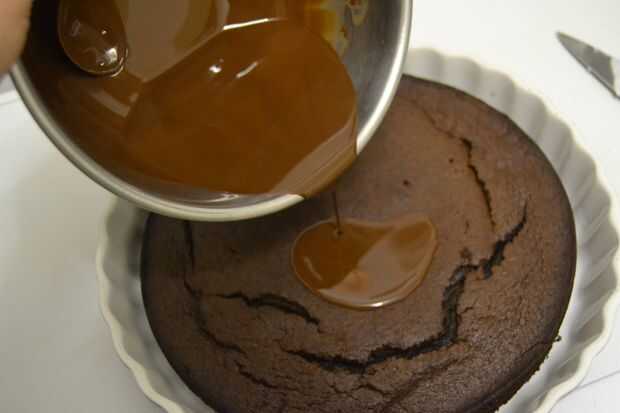 Tome la torta fría de la forma y ponerlo en un plato, luego vierte el chocolate líquido sobre el pastel para que la torta está cubierta uniformemente y el chocolate también corre por los lados del pastel y cubre así.