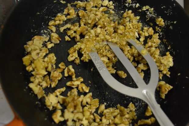 poner el azúcar en una cacerola y calentar a fuego medio. una vez azúcar empieza a obtener un color dorado (puede ser que el azúcar aún puede tener algunos tumores en ese momento, que no importa), añadir las nueces y la sal y revolver bien para que las nueces se cubren uniformemente con el caramelo salado. Ponga las nueces en un bol, lo contrario se peguen a la cacerola. para limpiar la cacerola, no empezar a fregar, remoje en agua hasta que el azúcar se disuelva.