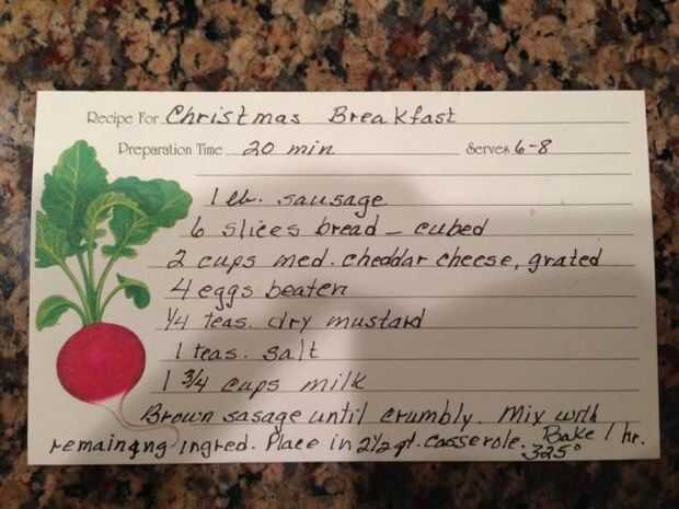 He publicado una foto por encima de la tarjeta original de la receta mi abuela utiliza cada año cuando se cocina la cazuela. Esta tarjeta incluye todos los ingredientes necesarios, cuánto tiempo se necesita para hacer (preparación y horno), cuántas personas esta receta sirve y una resumen breve instrucción de cómo preparar cazuela.