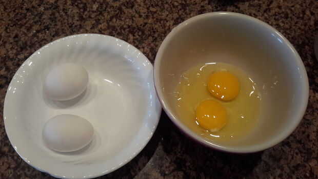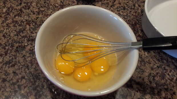 1. Crack todos los 4 huevos en el bol y batir con batidor hasta contenido de huevo es un color sólido.