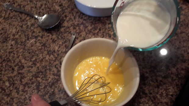 2. Medir 2 tazas de leche con la taza de medición y vierte en el recipiente con el contenido del huevo. Medir huevos y la leche con batidor hasta que quede un color algo sólido.