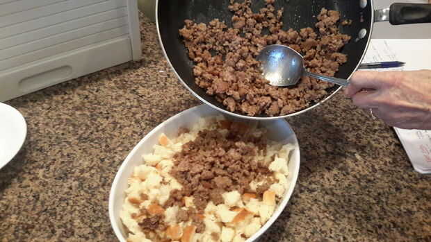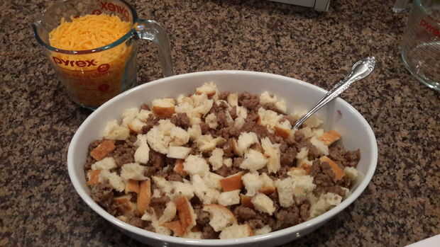 la parte más difícil de este plato es averiguar lo que llamarlo! Es como un quiche que cayó en budín de pan.Estoy acostumbrado a cocinar para una familia grande de hambre, pero todos han crecido y avanzado por lo que estoy tratando de cocinar porcion