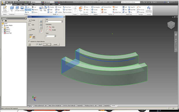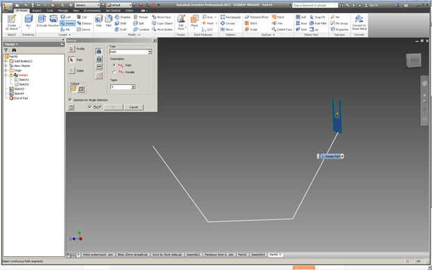 Terminar este esbozo, ahora seleccione el comando de barrido, la caja se abrirá pidiendo que seleccione el perfil, la cara de la 2.o bosquejo básico, luego seleccionar ruta y haga clic en la línea que usted marcó. Debe barrer el bosquejo de la parte básica en el camino de la línea que marcó creando un camino curvo.