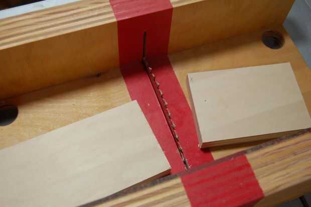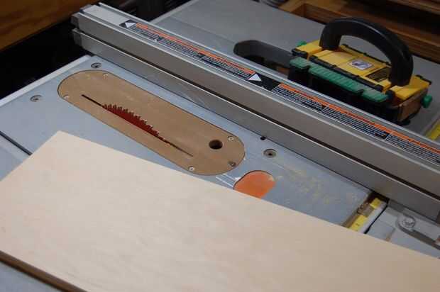 El panel trasero de madera contrachapada se arrancó a anchura utilizando la tabla VI y luego lo corte a la longitud utilizando un pequeño trineo de corte transversal. Un pedazo más pequeño de álamo se redujo a actuar como una plataforma utilizando este mismo método.