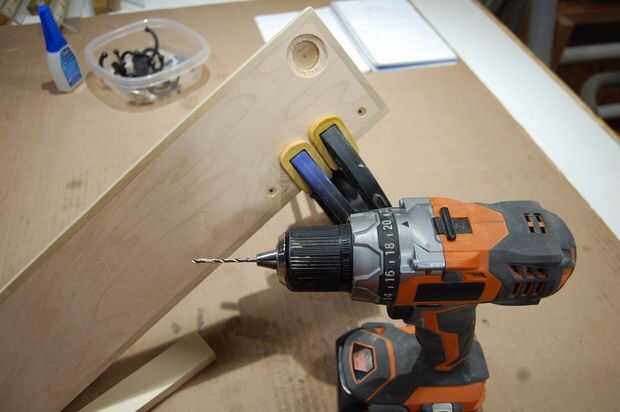 Antes de terminar, había perforado de los orificios necesarios para los ganchos y la plataforma de bolsa. La manera más rápida y más precisa para transferir esos agujeros a la plataforma es fijarlo con la abrazadera en su lugar. Luego, puede utilizar los agujeros establecidos como guías para pilotos en la plataforma de perforación.