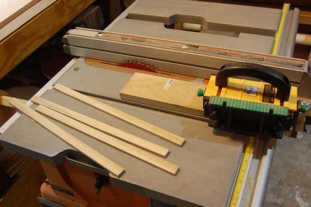 Empecé por cortar el panel de madera contrachapada a tamaño (dimensiones en el extremo) y ripear algunos chatarra de álamo de 3/4" en tiras de 1/4", que se utilizará como bandas de borde.