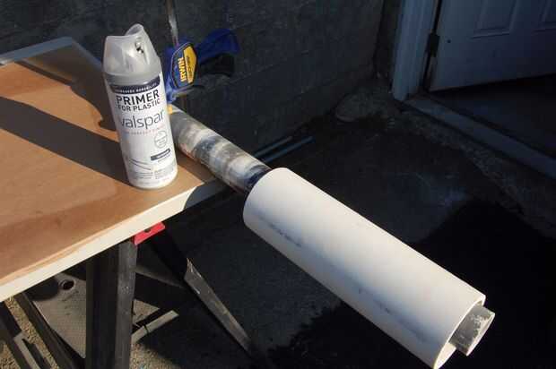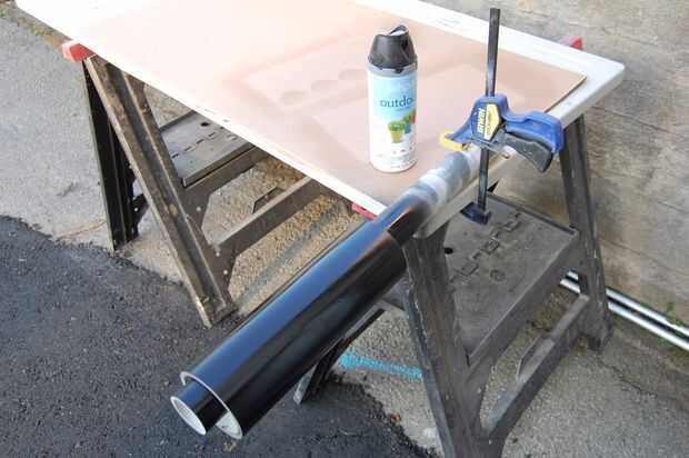 El tubo de PVC fue cortado para caber con la sierra ingletadora. Rascado la superficie un poco con el OSS, rociada dos capas de imprimación plástico y acabado con pintura en aerosol varias capas negras. Varias capas ligeras siempre es mejor que conseguir codiciosos y terminar con pintura en aerosol funciona. El rascar de la PVC podría no ser necesario ya que utilicé imprimación plástico, pero he tenido dejar antes en mercancías de la hoja de PVC y no quería arriesgarse.
