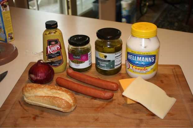 Seleccione su opción para el perro caliente, pero asegúrese de que es más largo que el pan.  El perro en la foto es casi de 3 1/4 de onza de carne picante y carne de cerdo, mi favorito actual, que viene de ahumadero de Trig en Rhinelander, Wisconsin.   El pan es un partido superior sésamo sembrada bollo, un buen pulgadas más corto que el perro.  Cebolla roja picada tiene una buena "mordida" a ellos, pero realmente cualquier cebolla amarilla es genial.