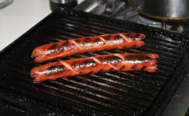 Cocinar salchichas en una plancha acanalada, como estoy haciendo aquí, o incluso sobre una parrilla de carbón.  Incluso una sartén de las obras.