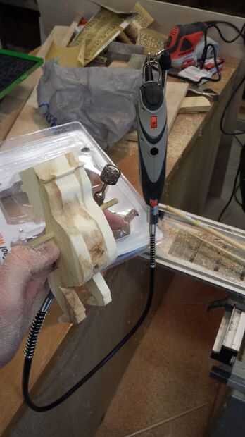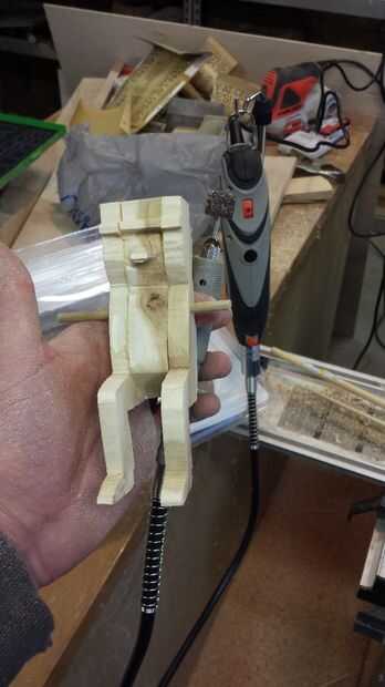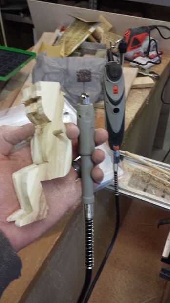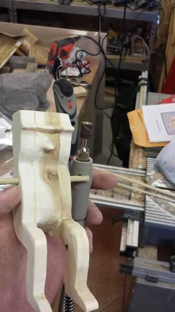 He seguido el método de Steve de hacer el hombre en tres piezas de madera pegadas. Para que lisa y encajan entre sí después de pegarles, hice un montón de lijar con un disco de lija en el extremo de un eje flexible con una herramienta Dremel. Trabajó muy bien para lijar las piezas y forma de su nariz y su sombrero.