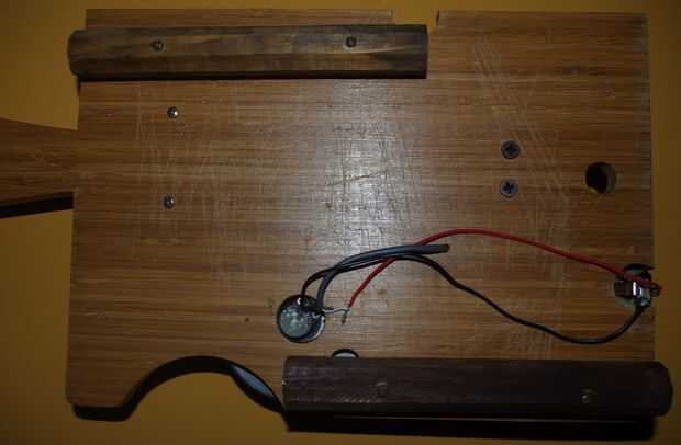 Perfore un agujero grande para el potenciómetro empujar a través a la parte superior de la tabla para picar y atorníllelo en el disco circular de metal Atornille el disco a la Junta Directiva y adjuntar un el botón al final de la el potenciómetro.