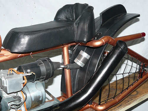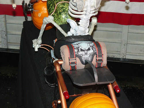 El asiento es algo complicado, requiere coser varias piezas de material junto en posiciones impares, para este i consiguió ayuda de un amigo de Tapice de mina que fue de gran ayuda. El rodillo de la cama era sólo un pedazo de goma espuma como el esqueleto es alto (aprox. 3 pies). Tomé entonces un trozo de material de 2 pies de ancho y 3 pies de largo. Cosidos a lo largo de los bordes con cojín insertado. Rodado para arriba, adjunto unas correas con velcro, también tuve el parche de cráneo puesta alrededor que es afixed al rollo de cama.