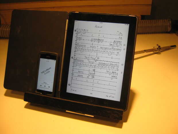 Como se puede ver, cómodamente tiene un iPad en un caso, así como un teléfono. En el raro evento que necesito utilizar realmente partituras, va sostener así.