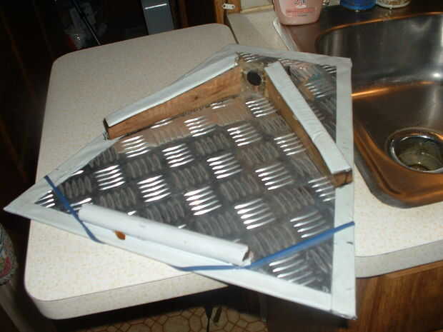 OK, estoy listo ahora. Si usted echa un vistazo a esta foto usted podrá ver lo que tenía en mente. En primer lugar para poner esto hacia fuera, empezó a correr la cinta adhesiva alrededor del borde exterior. Sin la cinta, habría una posibilidad de mí o de alguien más que corte en el metal.