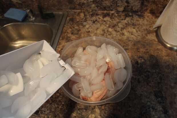 Cubrir el pollo con hielo... Luego añadir la salmuera de la temperatura a su tazón de fuente. Poner una tapa en ella y refrigere por un par de horas, o mejor aún durante la noche.