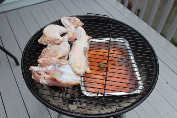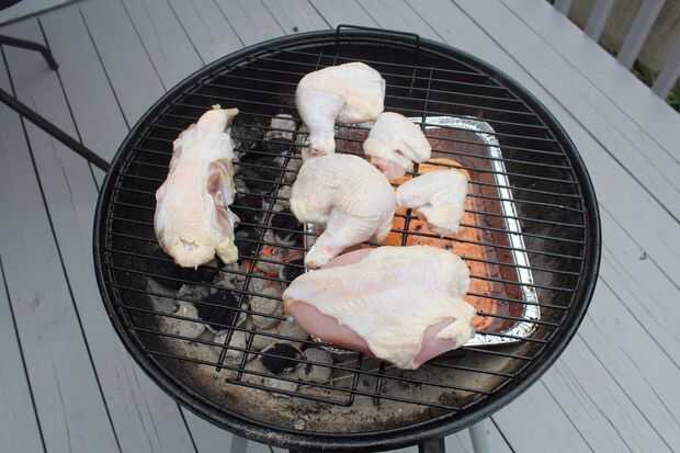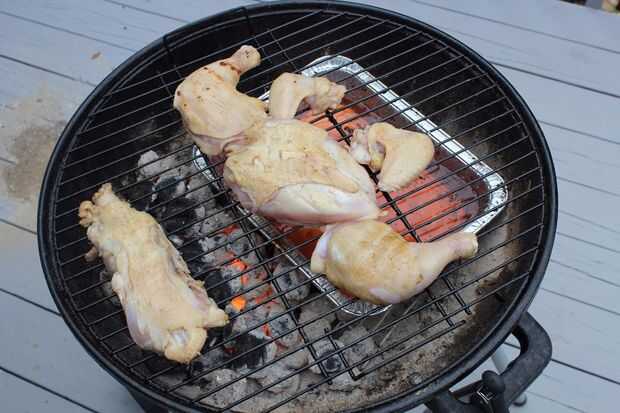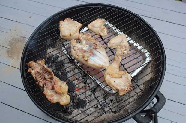Me gustaría empezar con el pollo sobre las brasas o llamas si está utilizando una parrilla de gas. A continuación, una vez que la piel se encoge un poco te muevo el pollo * excepto la espalda * al lado de la parrilla que está sobre el líquido. Cocinar durante unos 45 minutos comprobando y dando vuelta sobre cada diez minutos.
