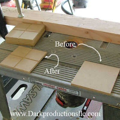 Ahora que tiene los agujeros perforados las plazas más grandes de lado y arrancar la tabla modeladora.  Para aquellos que no poseen uno puede lograr el mismo resultado con un router o modeladora.  Sólo asegúrese de que tiene una forma de mantener una línea recta mientras que usted está cortando las piezas.  Utilice la ranura en v del pedacito y una línea de corte a través del centro de sus plazas de 4 "X 4" para hacer la Cruz en el centro (ver imagen)