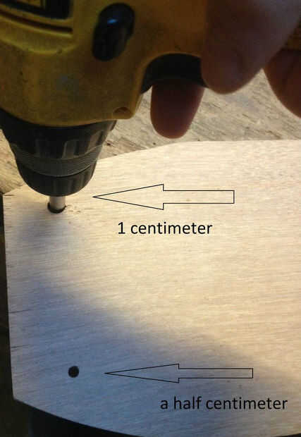 Después de que se dibuje los agujeros tienes que taladrar en las placas. Seguro que tienes que usar un taladro de madera para esto. Perfore dos agujeros de 1 centímetro y dos de medio centímetro.