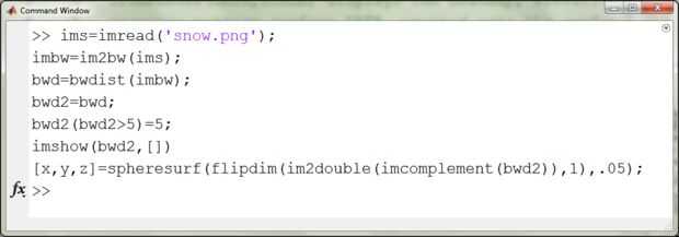 Luego importamos la imagen en MATLAB para su posterior procesamiento. Nuestro objetivo era deformar la imagen en una esfera con las palabras y los copos de nieve empotrados en la superficie de la esfera.