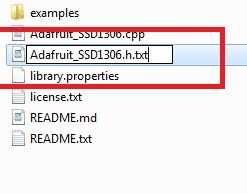 En esta carpeta, encontrar el archivo Adafruit_SSD1306.h , haga clic sobre él o presione F2 para renombrar, renombrarlo como Adafruit_SSD1306.h.txt luego parece encontrar esto de las oraciones en medio de los códigos, como: