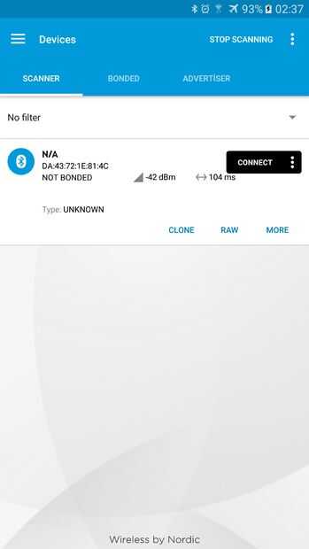 Ir a nRF programa Master Control Panel para Descargar de Google Play ahora, cargar y ejecutar esta aplicación necesita GPS y abra Bluetooth su teléfono. Buscar balizas disponibles. Ahora puede ver fácilmente lo que la dirección MAC es sobre tu tabla de nRF51-DK. (No olvides escribir a esta dirección MAC en caso olvide.)