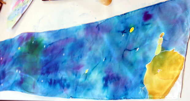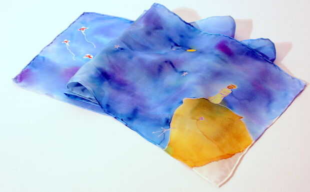 Entré casualmente en un pañuelo de seda en blanco, e inspiración pulsó una semana más tarde. Este lienzo debe ser mi homenaje al Principito. El estilo acuarela bloqueado de pintura en seda mallas maravillosamente con las ilustraciones en el libro. Además, he estado esperando volver a seda de la pintura por varios años, así que me alegré de que han afectado a lo perfecto.