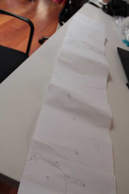 quería diseñar mi bufanda antes de realmente ponerlo en seda. En parte, estaba seguro que podía dibujar al Principito. Así que comencé hacia fuera en el papel: yo grapadas 8 1/2 x 11 hojas hasta la longitud correcta.