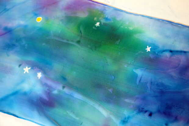 Ahora pintar la bufanda entera con agua. Las líneas que muestran en la siguiente imagen son de mojado secciones secciones secas de la reunión: los colores sangran a los bordes. Así que todo debe ser húmedo.
