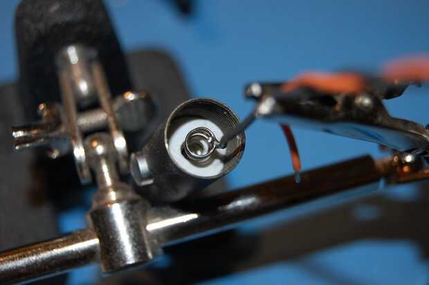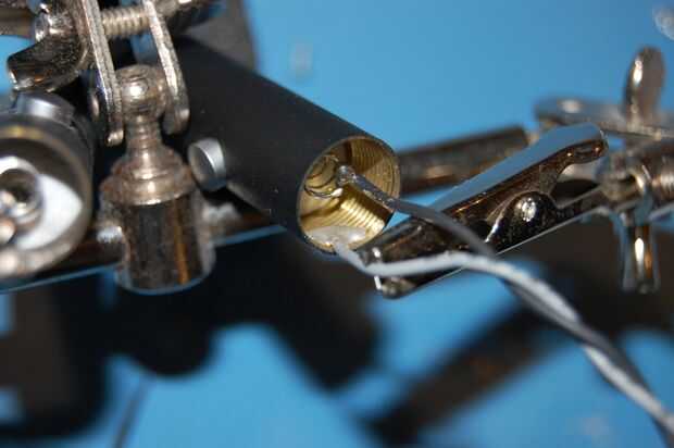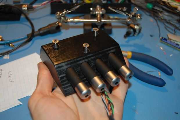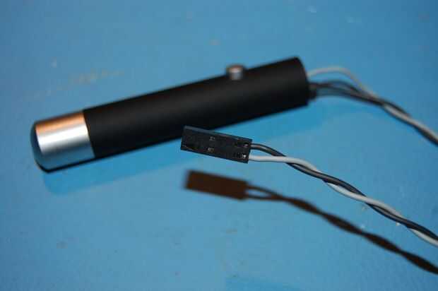 Los sensores se montan dentro de 1/4" tubo de latón, que pasa a tener el perfecto interior para adaptarse a un cuerpo de estilo LED fototransistor de 5mm de diámetro. El tubo ayuda a evitar que luz alcanzando el fototransistor, que es importante ya que es sensible a las mismas longitudes de onda como el ojo humano. Tuve que usar este tipo de fototransistor porque usé lasers verdes - fototransistores típicos no son sensibles en el rango de 550 nm, que es lo que produce el láser verde.