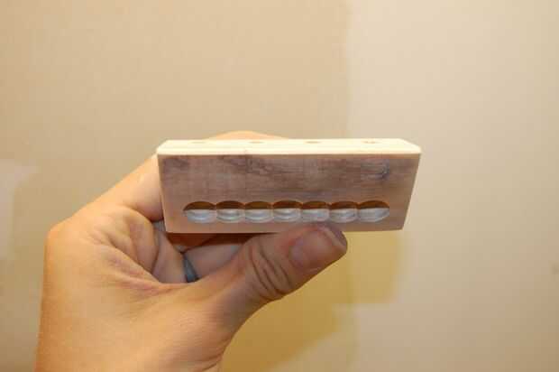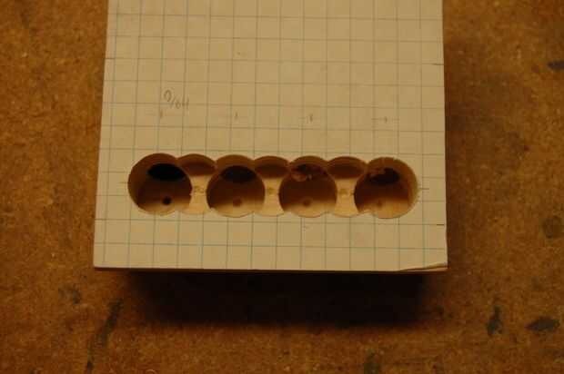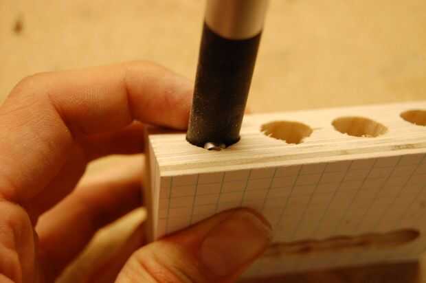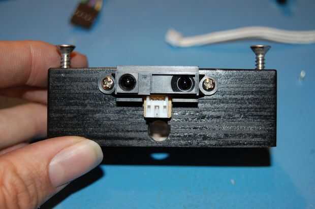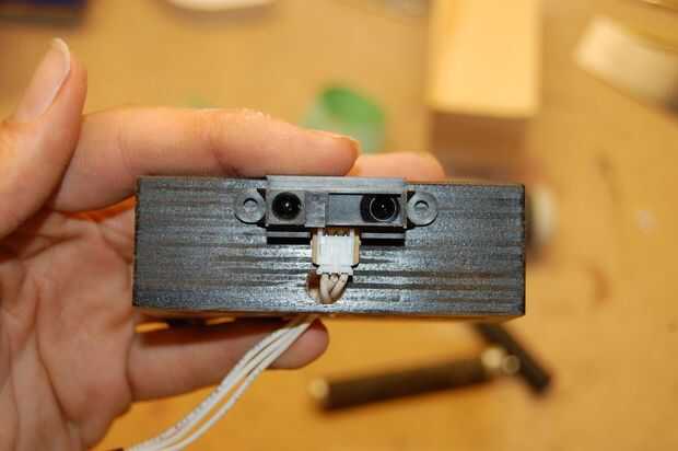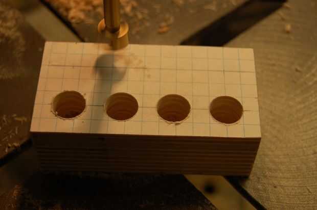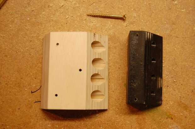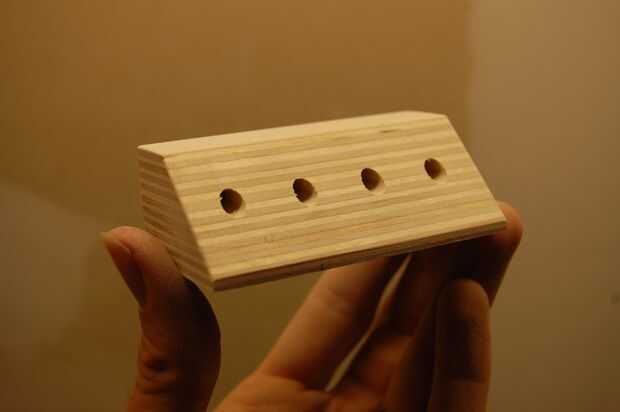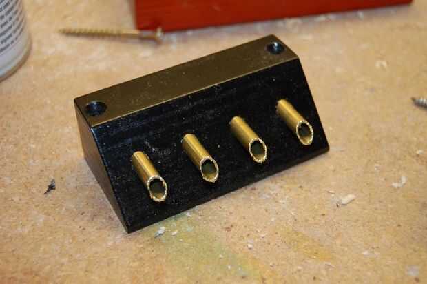 El bloque consta de cuatro orificios de 1/4" por un lado, en el cual se cuentan los tubos de latón. El fit es lo suficientemente apretado como para que no se necesita pegamento. Al lado de este bloque y los tubos mismos se corta en un ángulo de 45 grados, puramente por razones estéticas. Al otro lado del bloque es plano y proporciona un lugar para el sensor de la gama ser montado. Un agujero es perforado por debajo del sensor de la gama de los cables pasar a través.