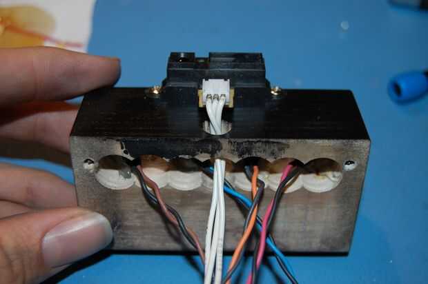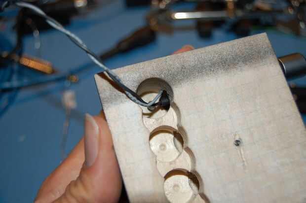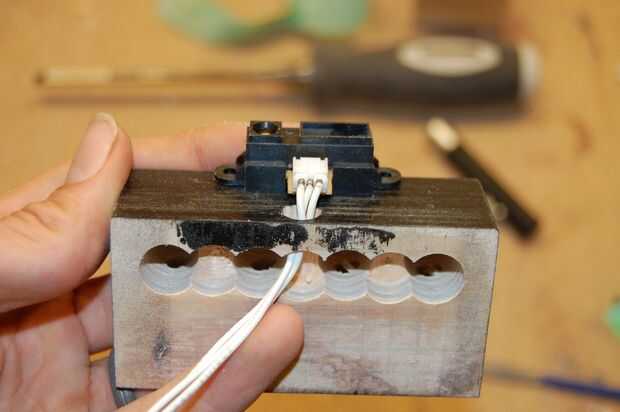 En la parte inferior del bloque del sensor, taladré orificios que se encuentran con los tubos de latón. Los fototransistores se insertan después de los tubos instalados y sujeta con un poco de pegamento caliente. Relleno de algún negro cinta eléctrica en alrededor de cada fototransistor, para evitar que la luz se escape de un sensor a otro. Dos hundido en agujeros se perforan en los extremos opuestos para montar el bloque a la guitarra.